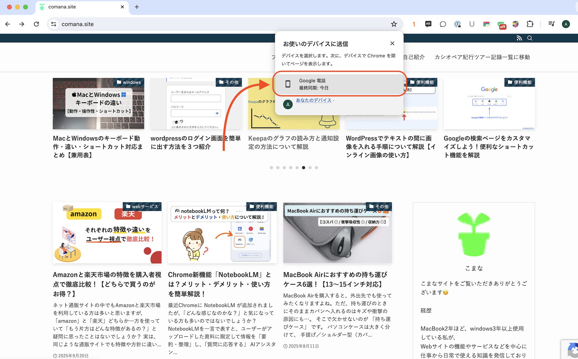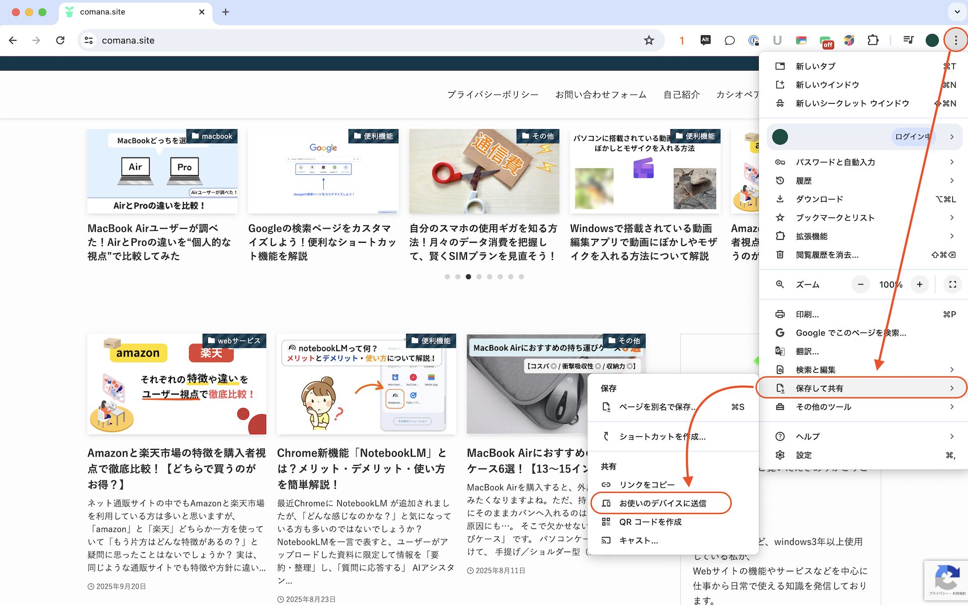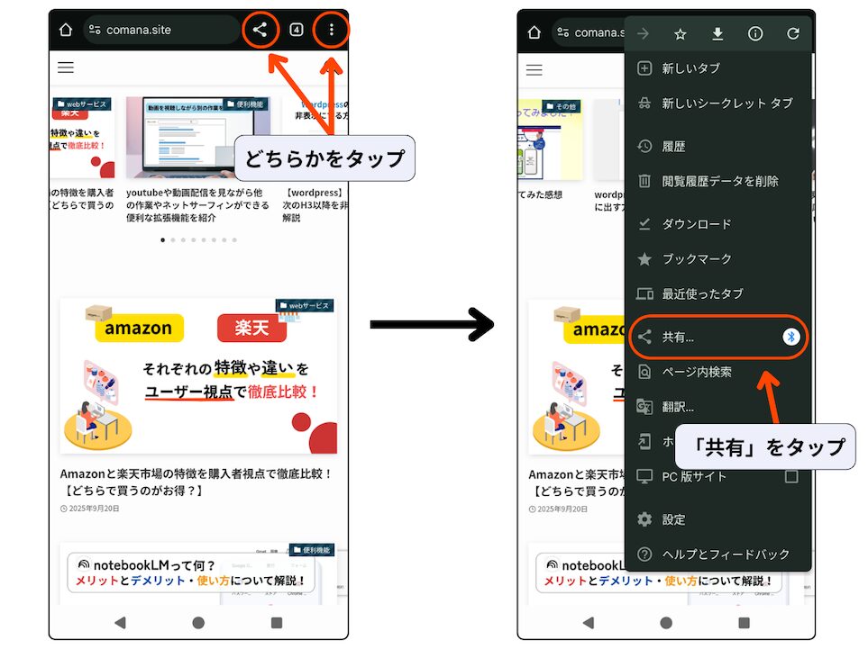 共有したいサイトを開き、右上メニュー(⁝)から「共有」→「お使いのデバイスに送信」を選択。