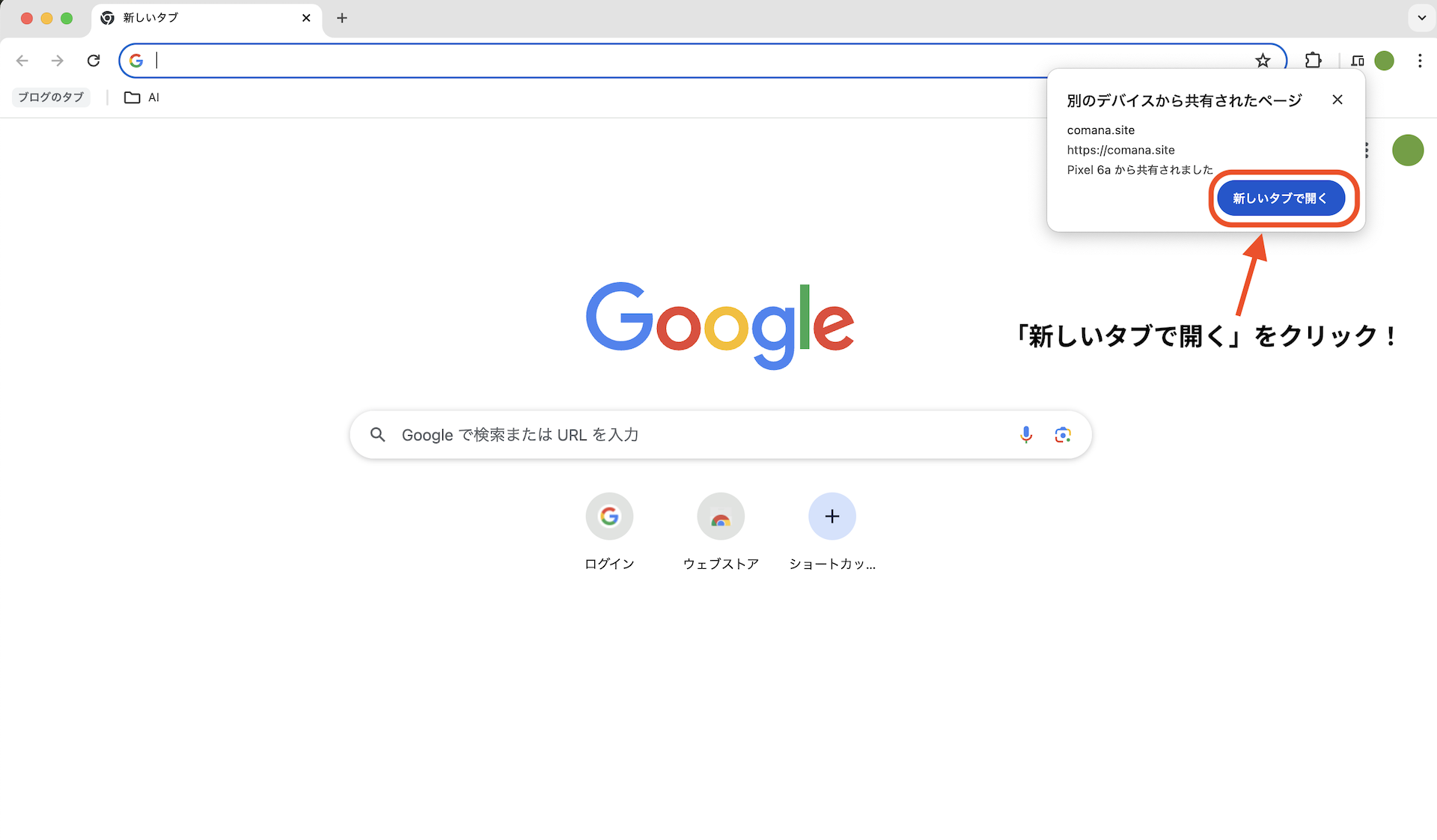パソコンの右上に『別のデバイスから共有されたページ』という通知が表示されるので、『新しいタブで開く』をクリックします。