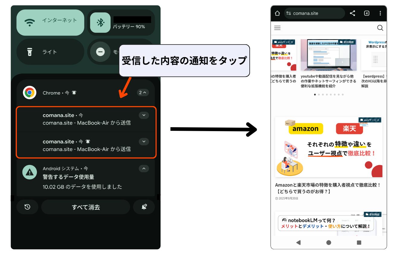 パソコンからスマホにURL(webサイト)を共有する場合、通知で届くようになっています。