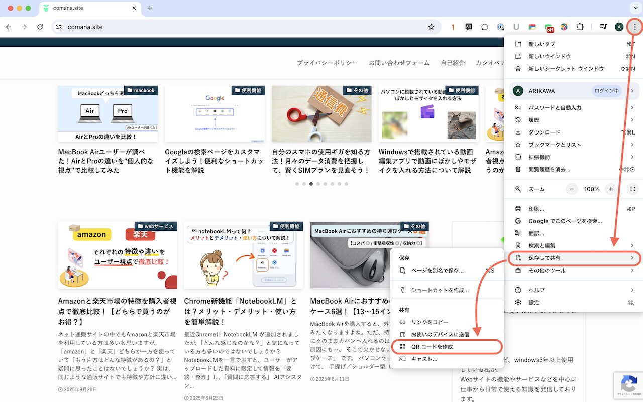 共有したいサイトを開き、右上メニュー(⁝)から「保存して共有」→「QRコードを作成」を選ぶだけでQRコードを生成できます。