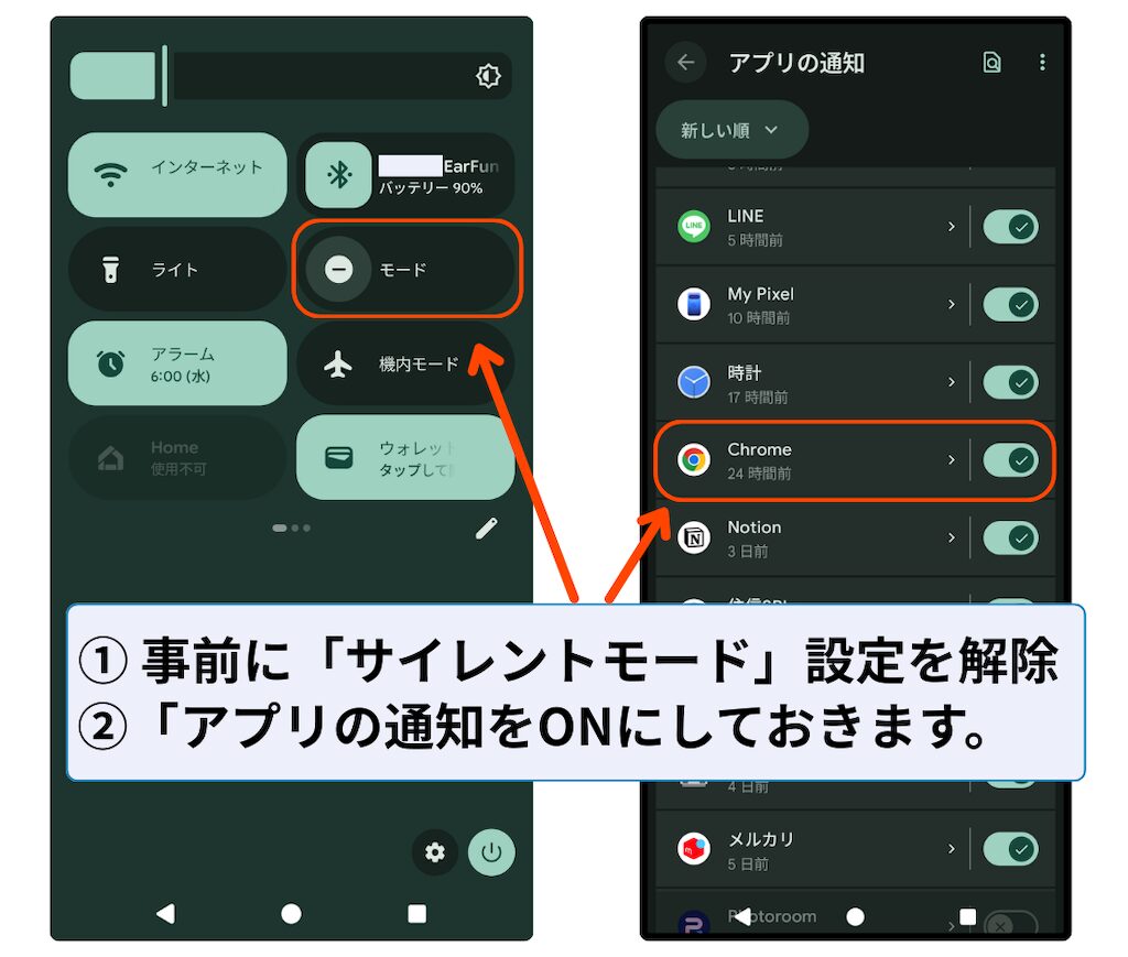 そのため事前に①『サイレントモードの解除』と②『アプリの通知をON』にしておきましょう!