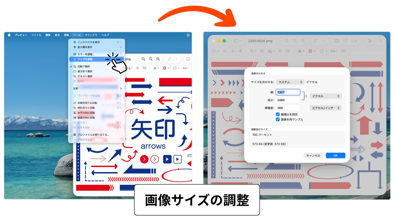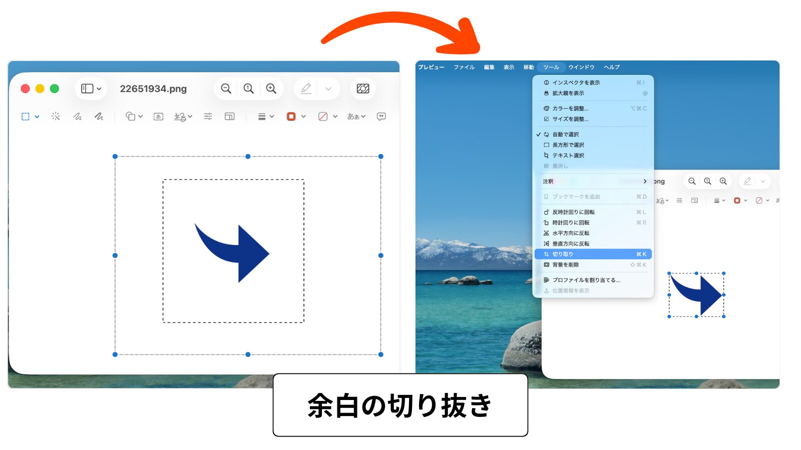 まずは重ねたい画像(今回は指矢印)をプレビューで開いて選択範囲で囲みます。