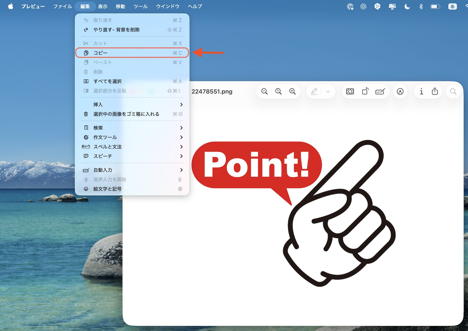 もしくは上部メニューの【編集 ➡︎ コピー】でも画像をコピーすることが可能です!